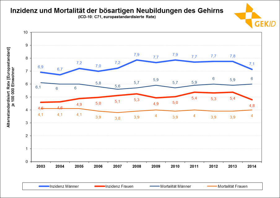Inzidenz und Mortalität der bösartigen Neubildungen des Gehirns – Altersstandardisierte Raten