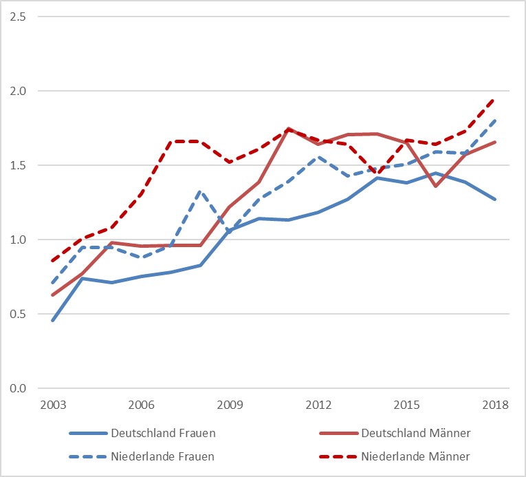 Die altersstandardisierten Erkrankungsraten (je 100.000 Personen, alter Europastandard) haben sich von 2003 bis 2011 in Deutschland mehr als verdoppelt, danach ist kein wesentlicher weiterer Anstieg zu beobachten. Verlauf und Höhe der Erkrankungsraten stimmen weitgehend mit den Ergebnissen aus den Niederlanden überein (Abbildung 1). Der Verlauf spricht dafür, dass der initiale Inzidenzanstieg eher auf Verbesserungen im Bereich der Dokumentation und Kodierung zurückzuführen ist und weniger auf eine tatsächliche Erhöhung des Erkrankungsrisikos.